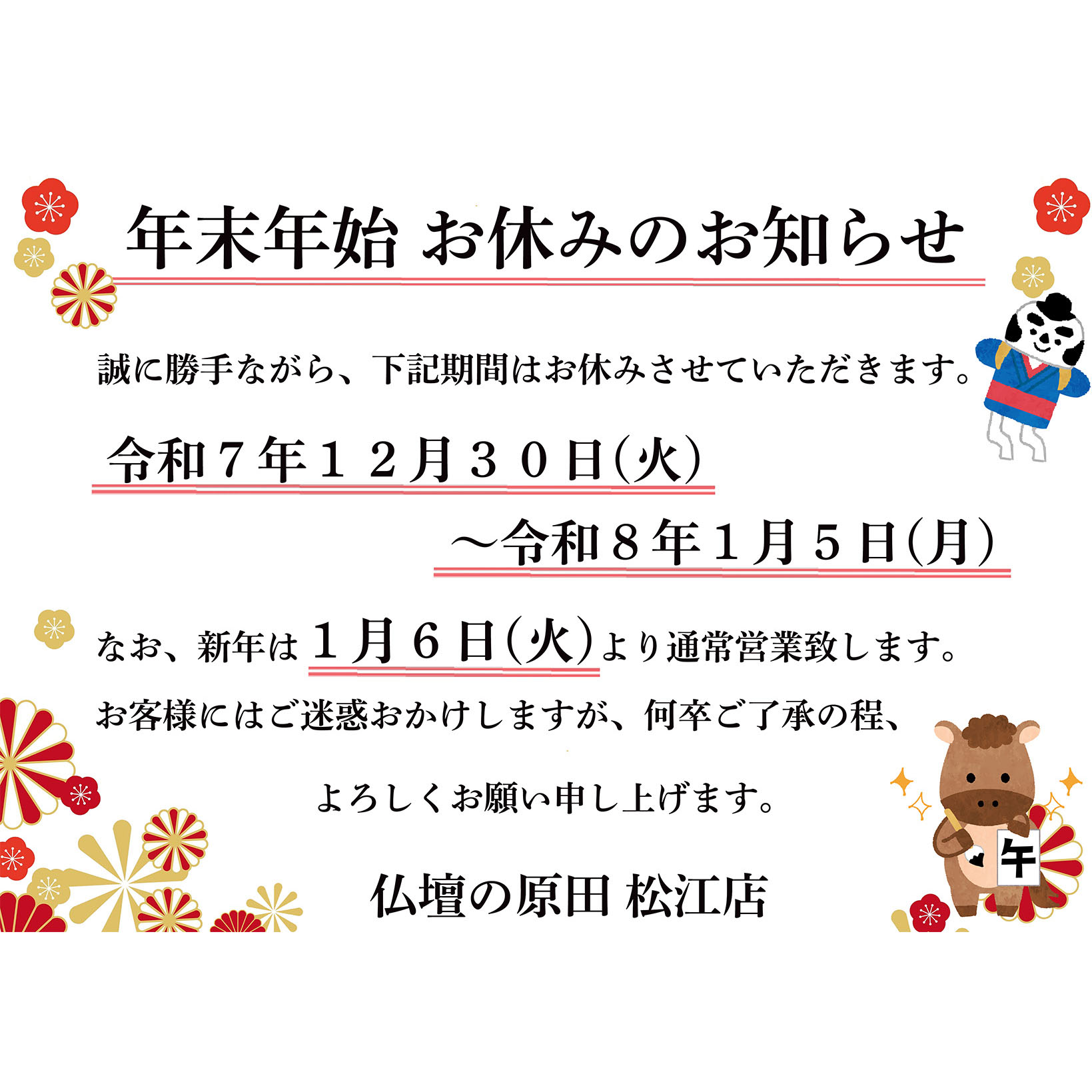 2025/12/22 ◇松江店 年末年始 お休みのお知らせ◇ 誠に恐れ入りますが、 令和7年12月30日(火)~令和8年1月5日(月) の期間、年末年始のためお休みさせていただきます。 なお、松江店は毎週火曜日を定休日としておりますが、...