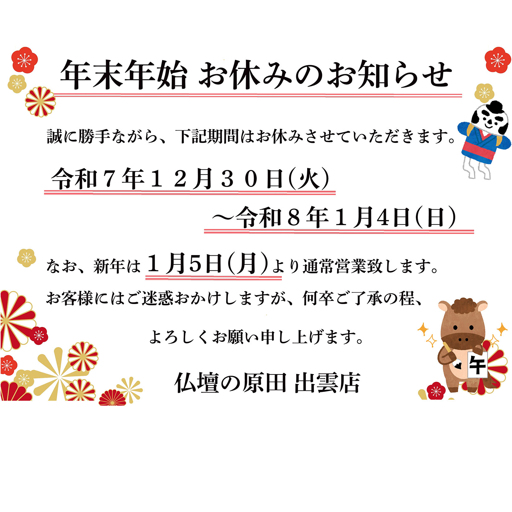 2025/12/24 ◇出雲店 年末年始 お休みのお知らせ◇ 誠に恐れ入りますが、 令和7年12月30日(火)~令和8年1月4日(日) の期間、年末年始のためお休みさせていただきます。 なお、新年は令和8年1月5日(月)より通常営業いたしま...